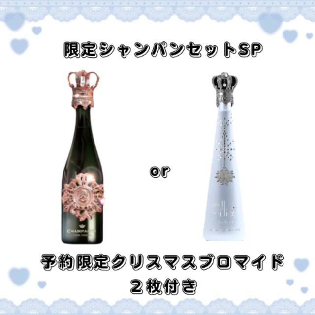 クリスマス限定ブロマイド2枚付きの予約シャンパンになります。 備考欄に、 ・キャスト名 ・お客様のお名前(ハンドルネーム) ・色の指定の有無 (ピンク、水色) ・イベント当日の来店日時 こちらの商品は店頭受け取りのみになります。